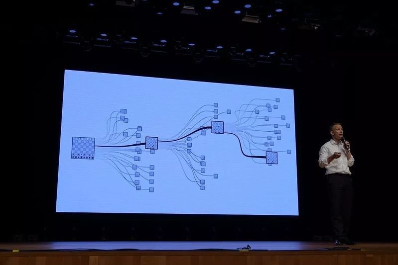 石博盟首先从AlphaGo的发展历程讲起,介绍了其前身Deep Blue与加里·卡斯帕罗夫的国际象棋较量,那是AI走向世界的第一步。但一直以来,围棋都就被认为是传统游戏中对人工智能最具挑战性的项目。这不仅仅是因为围棋包含了庞大的搜索空间,更是因为对于落子位置的评估难度已远远超过了简单的启发式算法。之后,通过不断的改进以及AI智能的自我学习功能,初级的AlphaGo能够进行围棋的对决。围棋相对于国际象棋的难度呈指数级增长,被公认为是传统游戏中对人工智能最具挑战性的项目。因为国际象棋每一步都可以被深度计算出所有的可能性,而围棋的计算量则远远超出了机器的承受能力。