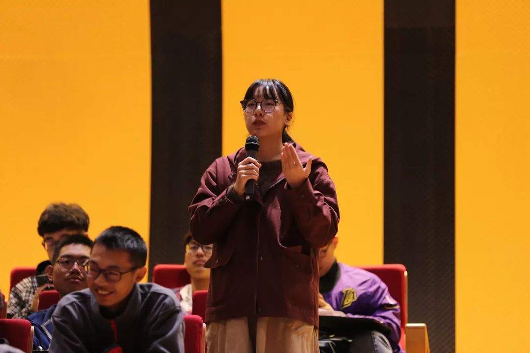 在讲座最后的提问与交流环节,在场同学们热情洋溢,话筒在观众席内多次传递,山田刚史先生就参观者的衣着颜色是否会对光影的展示效果造成影响、作品中的哪些部分是其认为无法被抄袭/重制的、在巨幅幕墙上使用的器材及技术等多个从技术层面到意识层面的问题展开了生动的解说和讨论,在此过程中对已经展示的图片和短片进行反复地重放与解析,使其他同学也对teamlab这一系列的作品有了更深层次的理解。最后,在大家意犹未尽的掌声里,本次讲座画上了完满的句号。