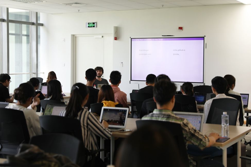 2018年5月24日下午,来自纽约大学的艺术家、创艺编程家Gene Kogan在图书馆201-8向参加工作坊的同学们介绍了人工智能和机器学习在艺术创作的应用,展示了他们团队在音乐信息检索、人体语言等成果。随后Gene Kogan讲解了关于机器学习里面的训练集、学习算法、神经网络等概念,并手把手指导同学们如何进行创意编程及代码实现。工作坊现场气氛热烈,有问有答,教学相长。活动结束后同学们表示收获良多。