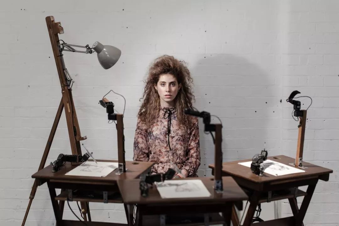 《人类研究#1,3RNP》是人类作为演员的装置。在让人联想到写生课的场景中,人类扮演模特的角色,被3个机器人描摹。一位助手将画纸置于机器人的桌子上,然后扭动它们的手臂,将它们唤醒。机器人被设定为极简艺术家,只能沉迷于绘画。这些名为 Paul-n 的机器人,看上去像是过时的数码相机,或是低分辨率的网络摄像头。他们聚焦于模特,或注视正在进行的绘画当中。