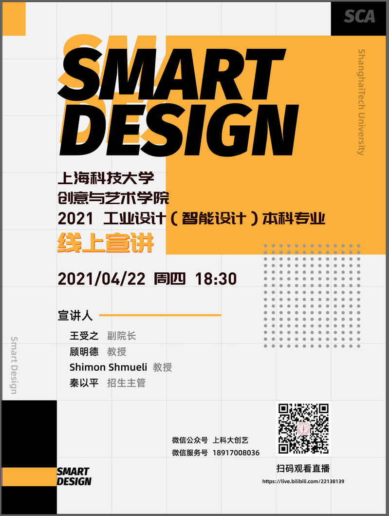 观看招生直播:“点击此处”进入上科大招办B站直播室,观看明天(4/22)晚18:30的工业设计(智能设计)直播宣讲。