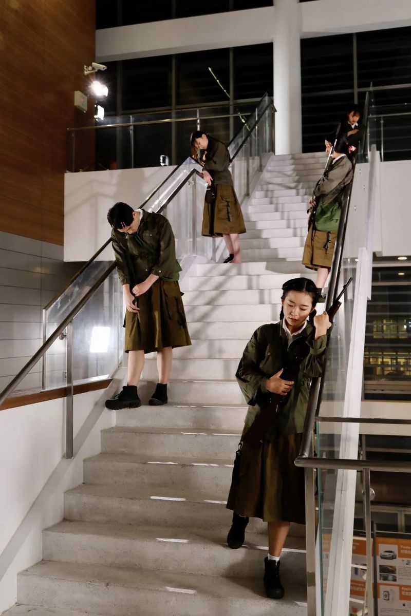 值得一提的是,本学期大家首次尝试了有高低落差的场地作为舞台,增强了空间层次感的同时,对灯光布置和演员的舞台移动路线设计是不小的挑战。在周涛老师的指导下,大家巧妙地利用了现场的楼梯和平台,营造出河流、高山和森林等不同场景,配上现场的音效和灯光变化,可谓是身临其境。同学们全身心投入表演,观众们也看得入神。跟着演员们的视线,大家慢慢走进了这个凄美的故事,看到了战争带来的痛,也看到了灾难中最真挚和纯净的情感。