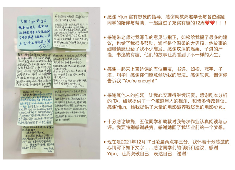 「在最后写剧本之前,叙事与表达是我每周最为期待的课程。超级超级开心和大家一起分享、讨论、聊天,一起度过这学期!然后,非常感谢大家对我的鼓励和安慰,我已经完全单方面地认为我和大家都是好朋友啦哈哈!轶隽老师是我见过最酷的老师,无论是课上学习还是课下和老师聊天都对我帮助很大,超级感谢老师!」