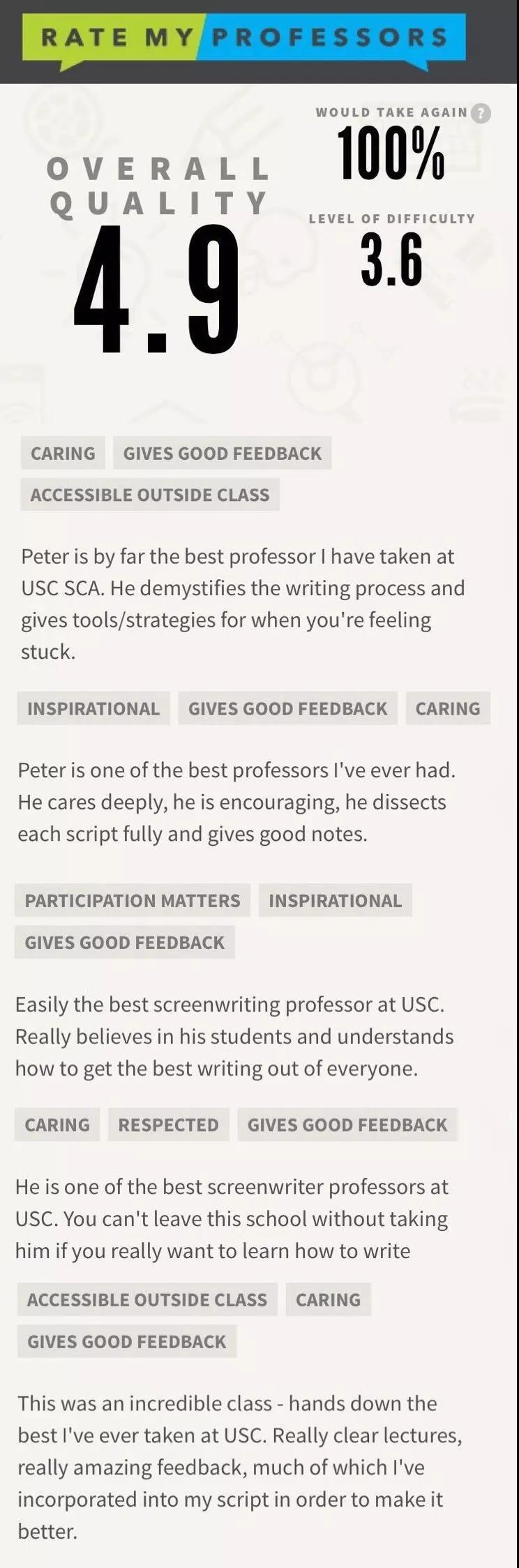 Peter has been teaching at USC SCA since 2008. His knowledge, passion and dedication has made him USC SCA’s one of the top rated writing professors. Here’s what his students say: