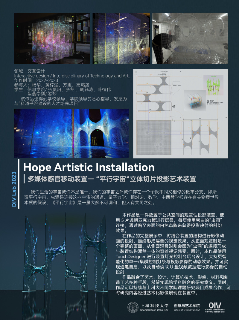 Design Interaction Visual Lab (DIV) is dedicated to exploring the possibilities in the creative industry and expanding the boundaries of the creative processes. The creative products will foster new types of social interactions among citizens, designers and scientists, where everyone will participate in the interactive design in areas of life-style, smart city, smart entertainment, smart social welfare and education. Adopting a cross-disciplinary approach, the areas of DIV spans the research and practices in design, fine arts, human-computer interaction, participatory design, design for behavioral change, Artificial Intelligence, engineering, computer science, sociology, anthropology, communications, business, cultural studies and other relevant social science areas. The laboratory welcomes researchers from other colleges of ShanghaiTech University of Science and Technology, and actively cooperates with other research centers and external partners in the university to jointly promote new research results in the fields of intelligent living environment, artificial intelligence innovation and aesthetics. The main focus of DIV is on the relationship between people and innovative technologies, with the goal of creating more useful interactions between people and their living environments in the future smart urban landscapes.