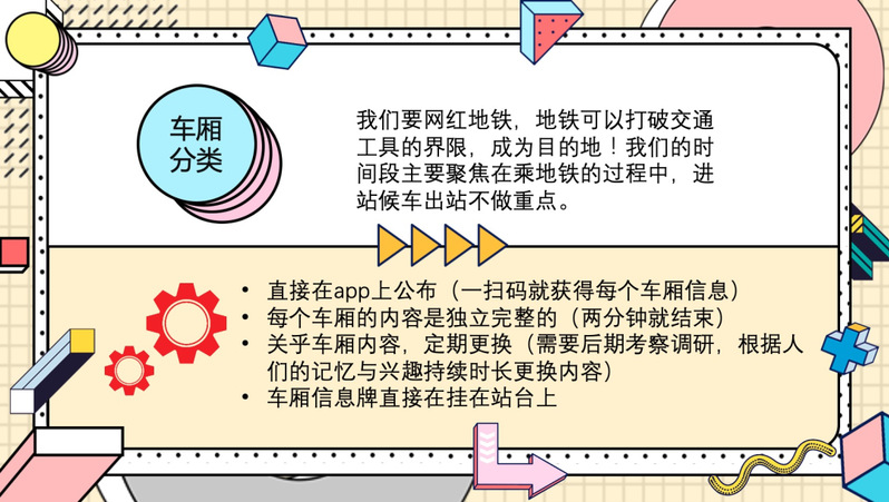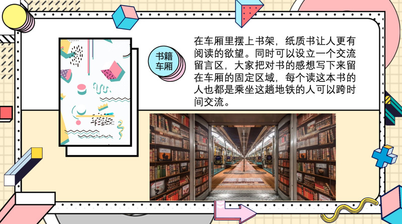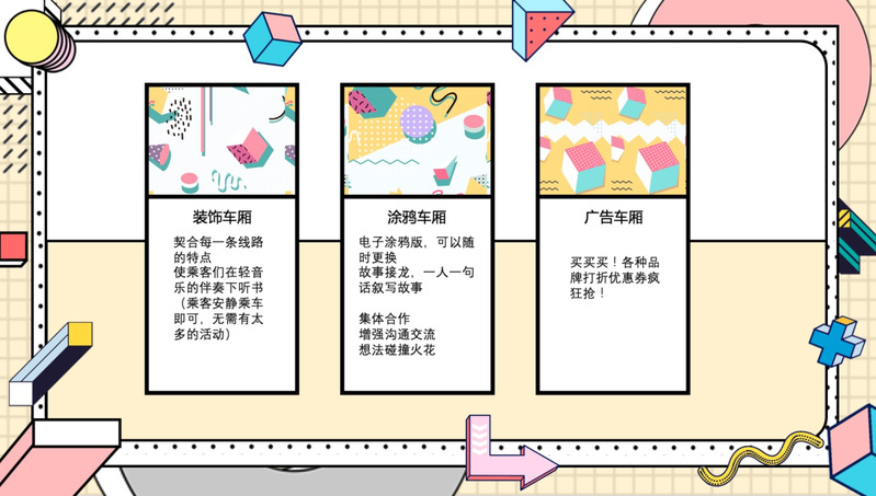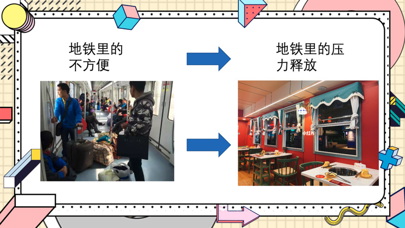 Focusing on the stress release in the subway, it investigated the ways that office workers in Zhangjiang area want to release stress, such as listening to music, watching movies, reading books, shopping, etc. Then we propose to design special themed carriages to meet people's needs, such as music carriages, book carriages and so on. We also designed applets to optimize the user's experience, and made videos to demonstrate the expected effects. We want to make the subway not just a means of transportation, but a place for people to relax and communicate with each other.
