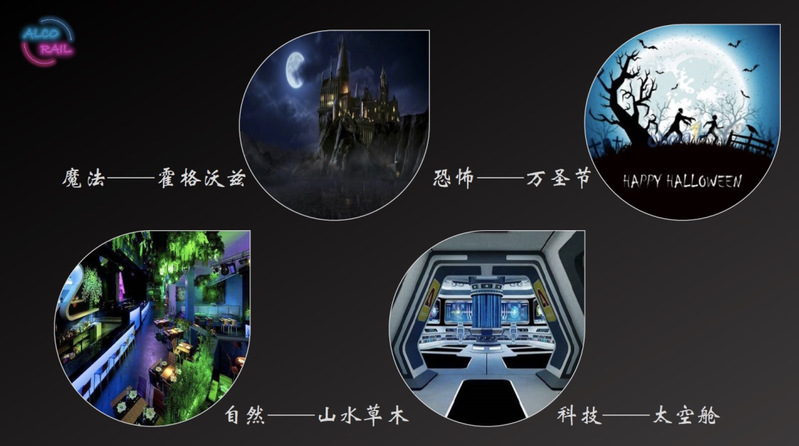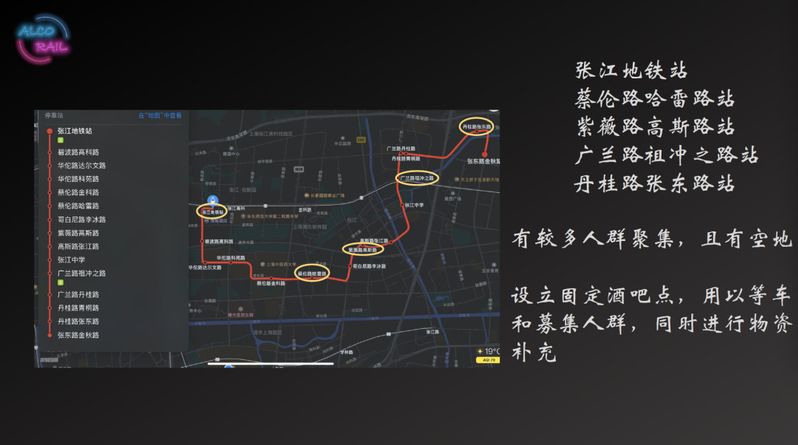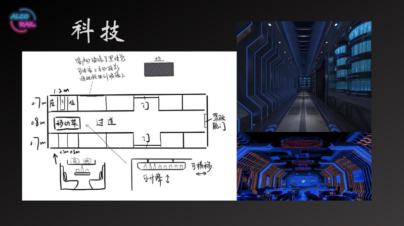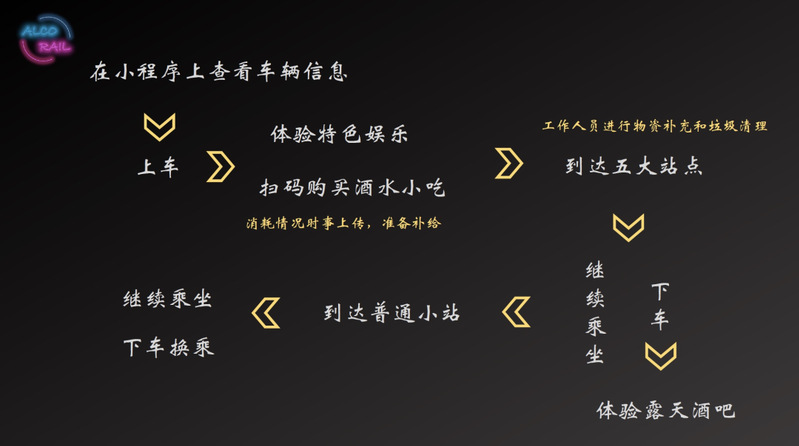 ALCORAIL will be divided into two parts: the train and the open-air bar. The open-air bar is responsible for gathering people and supplying the train; and the train is divided into four themes to meet the needs of different groups of people. In the design of the train, a large number of high-tech, such as AR, etc. are integrated, which can not only enrich the passenger experience, but also highlight the characteristics of Zhangjiang. The one-way train is 9km, with a speed of 10km/h, and a round trip takes about 2 hours. It operates from Sunday to Thursday from 19:00 to 24:00, and from Friday to Saturday from 18:00 to 2:00. The ALCORAIL project can be used not only as a new entertainment and social model, but also as a landmark in Zhangjiang, highlighting the vitality of Zhangjiang.