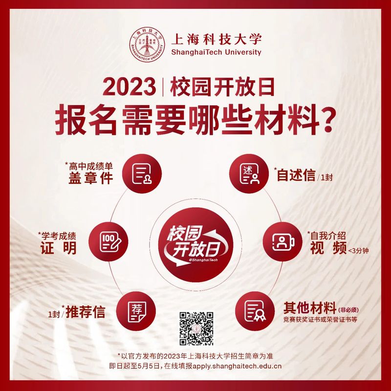 报名时间:2023年5月5日截止地点:上海科技大学一图看懂报名材料上海科技大学“校园开放日”报名受到了广泛...