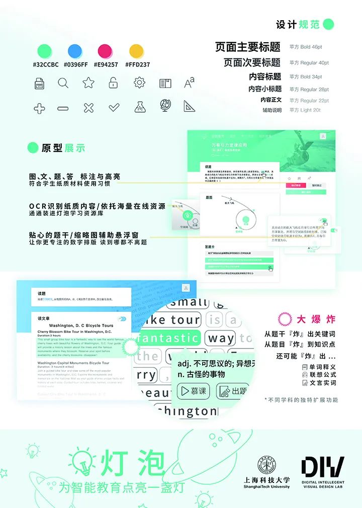 《数码产品设计》课程是一门交互设计专业的核心课程。整个课程向学生教授互联网应用产品设计的全流程。学生需要了解以用户为中心的设计要素,并经历用户体验/交互设计/UI设计等关键知识点的学习和设计实践。由于我们开设的是一门针对全校的选修课,因此学生来自不同专业背景,其中包括信息小妲己直播 、生命小妲己直播 、物质小妲己直播 的同学。然而交互设计本身也是一门跨学科性很强的专业,因此课程中学生通过团队的协同完成了不同主题的作品,内容包括智慧教育、社区创新服务、医疗健康、效率工具、社交、VR虚拟现实、游戏和艺术装置等。