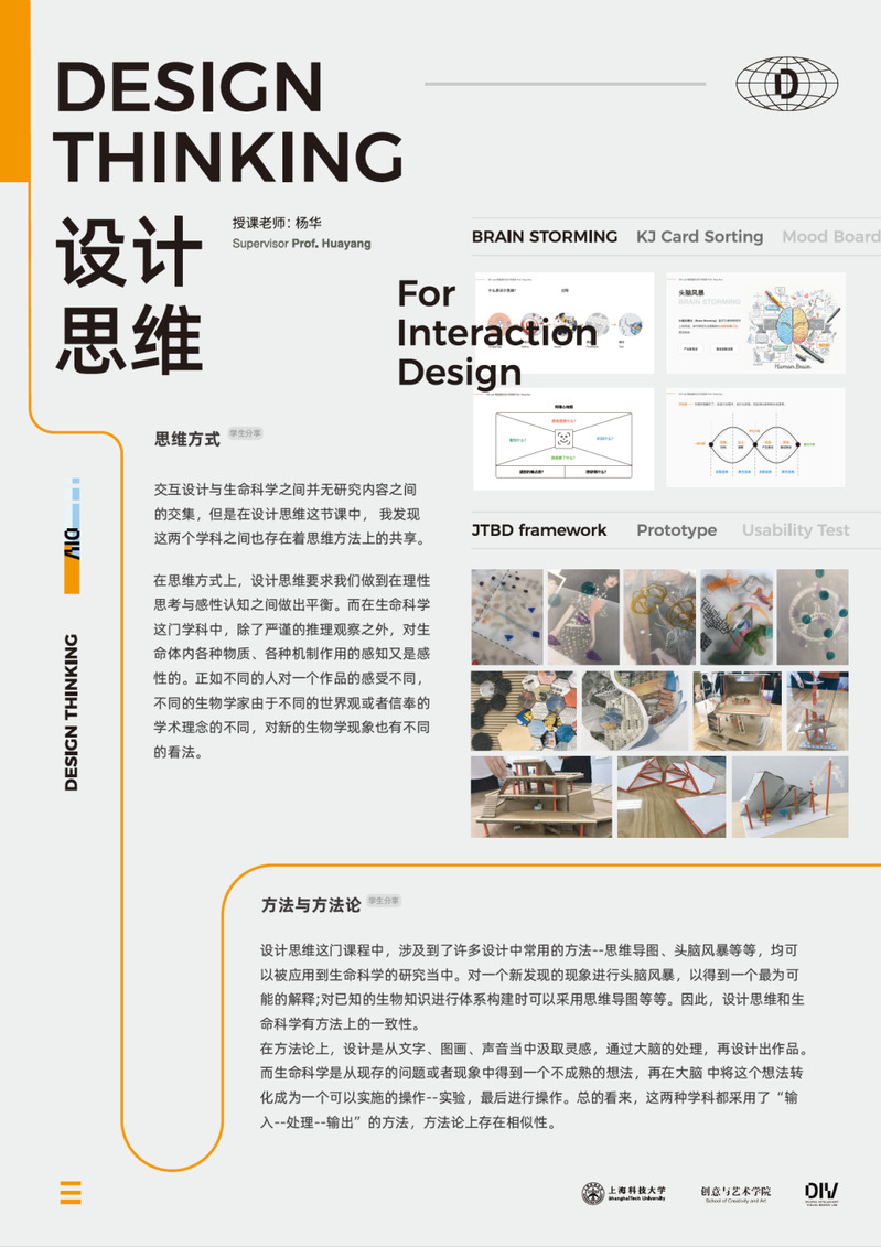 “由交互设计到生命科学交互设计与生命科学之间并无研究内容之间的交集,但是在设计思维这节课中, 我发现这两个学科之间也存在着思维方法上的共享。思维方式在思维方式上,设计思维要求我们做到在理性思考与感性认知之间做出平衡。而在生命科学这门学科中,除了严谨的推理观察之外,对生命体内各种物质、各种机制作用的感知又是感性的。正如不同的人对一个作品的感受不同,不同的生物学家由于不同的世界观或者信奉的学术理念的不同,对新的生物学现象也有不同的看法。”